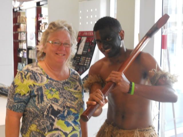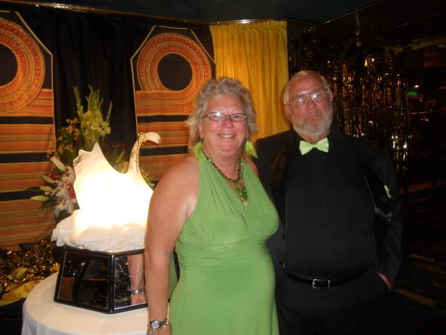 Bula Bula - that is hello and good-bye in Fiji... Two days ago we were in New Caledonia which was a new island/country for us. We rode the hop-on/hop-off bus, but we never hopped off...lol! The island was pretty and the beaches looked ok but we just toured it then checked out the shops... Oh, did I mention this was a French territory? So although the people were nice enough the place was outrageously expensive! They wanted over $40 for cotton mumus and almost $15 for a small round of brie cheese! And butter was almost $7/lb. The best "souvenir" was a loaf of french bread ($1.10) and we took it to dinner that night... lol! Our trivia team has been doing a bit better lately and we actually won yesterday... We got 14 out of 16 correct! It was formal night last night - I had plans for wearing tropical tourquiose, but the weather was crummy so no sunning was possible... We wore lime green instead: